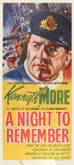 |  | | Australian Day-bill 14" x 30 1/2" tall - A conition | The Rank Organisation presents with Pride Kenneth More in The Greatest Sea Drama in Living Memory A NIGHT TO REMEMBER from the book by Walter Lord - 1958 | $250.00 | MP1838 | |